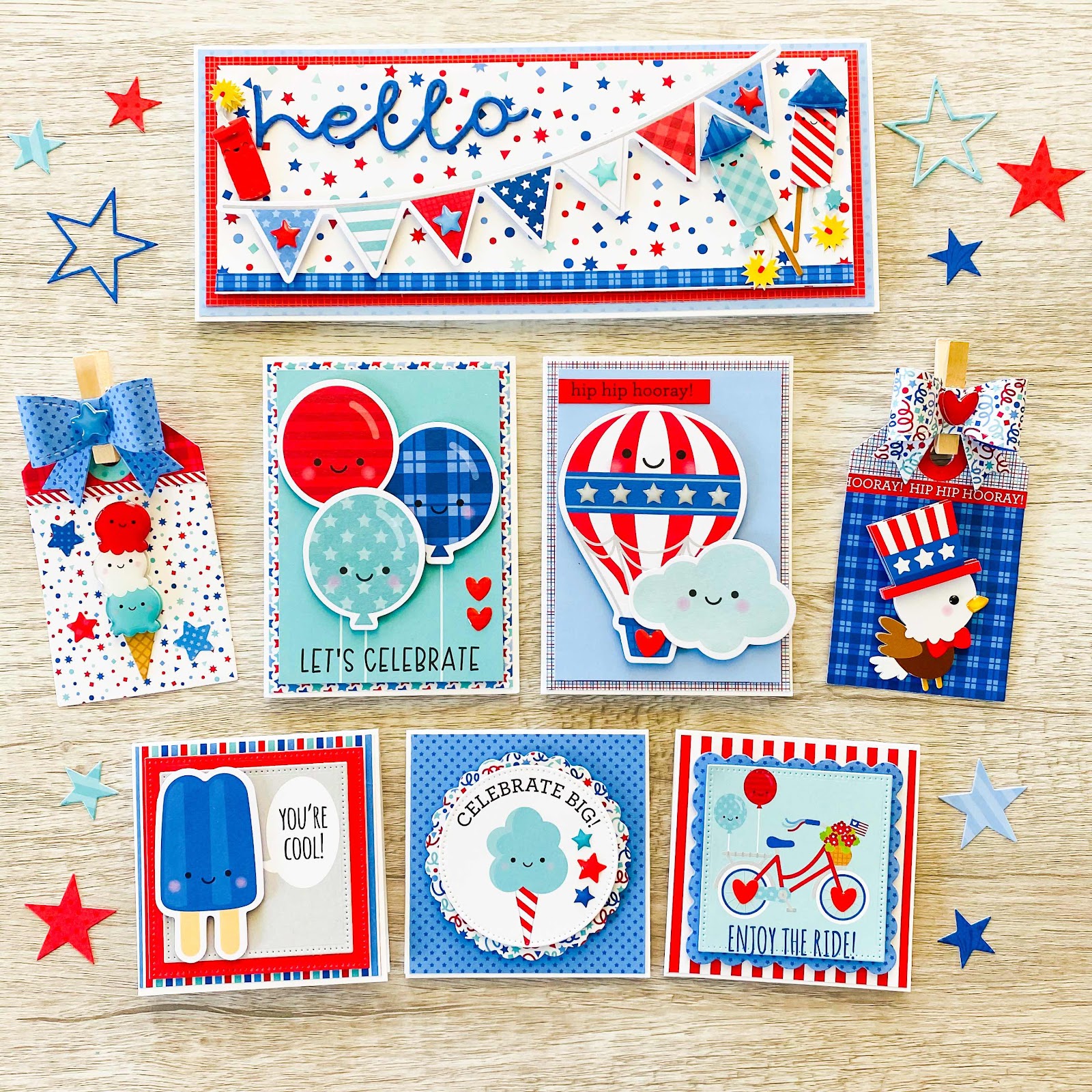 I am absolutely in love with Doodlebug's new Land that I Love Collection! And there’s just something special about the red, white and blue color combination that makes me happy. It’s awesome for 4th of July cards, layouts, albums and other projects, but doesn’t always have to be just for that! For today’s project I created an assortment of cards and tags using a bunch of elements from this adorable collection. Here’s a look: